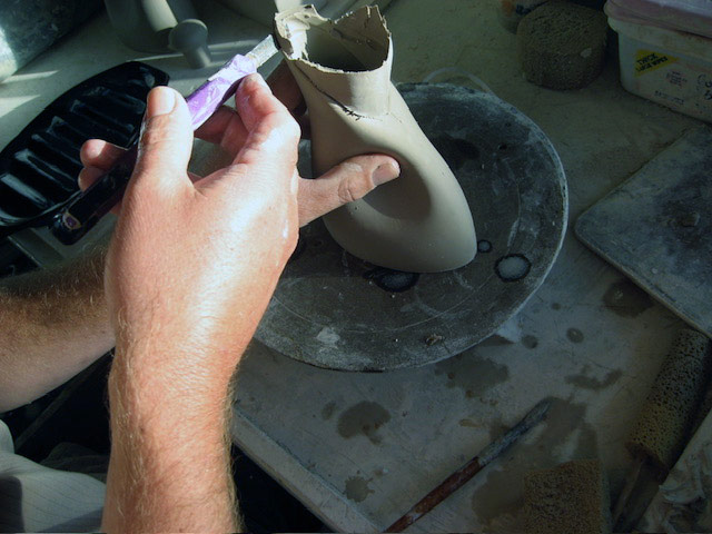 The work is fettled (removal of any excess clay), and often the piece is sponged to smooth the surface of any remaining imperfections.
