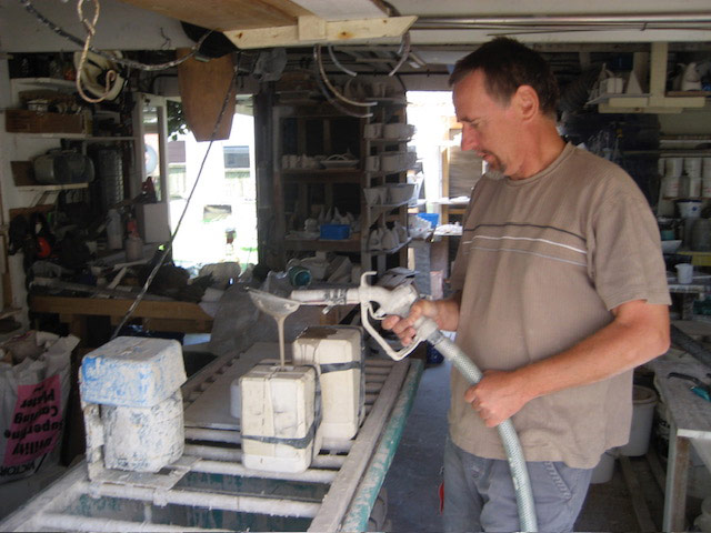 After returning from time overseas in 1986 he was introduced to slipcasting and bright coloured underglazes by Sue Newby and Bruce Haliday. They spent six months learning to make moulds, often getting advice from Tom Hodgkins a former mould-maker at Crown Lynn.